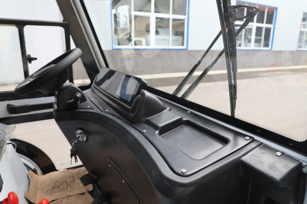 駕駛室材質及燈具 鋼制結構,8字管一體折彎成型與鈑金拼組結構合理,美觀大方,前一體化嵌入式LED大燈,塑料儀表工作臺,儀表總成包含高亮度電子數顯儀表、7寸液晶大屏MP5(帶藍牙、USB接口)、紅外線高清倒車影像,帶雨刮器,警示燈。